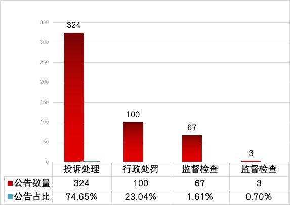 行政处罚结果公告100则,占23.04%。其中,在投诉处理中发现问题67,因监督检查、举报等发现问题33。