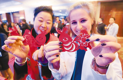 11月8日晚,北京市政府“APEC·工商之夜”欢迎会举行,图为APEC工商领导人峰会嘉宾在现场体验中国文化。