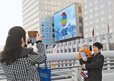APEC会标成为北京新的城市景观。图为市民在奥林匹克公园附近的LED巨屏播放的APEC会标前拍照留念。